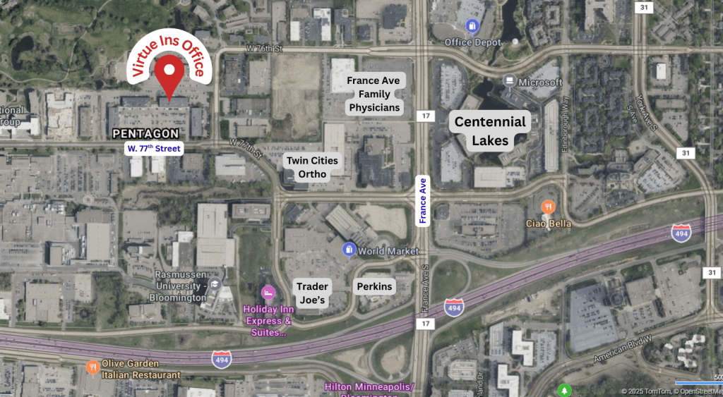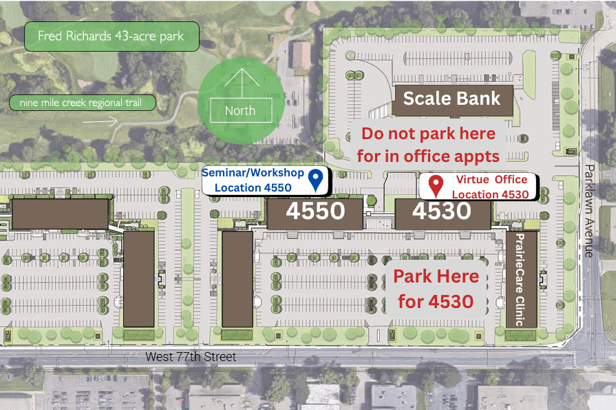 Due to the large amount of community events we participate in, our office is by appointment only. It is located in Pentagon Park Office park in Edina, just 3 blocks from the Centennial Lakes building off France Ave S.